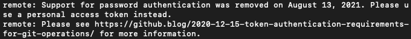 2021년 8월 13일 부터 비밀번호 인증지원을 중단했으며 personal access token을 대신 이용하라는 메시지와 함께 동작하지 않았다.