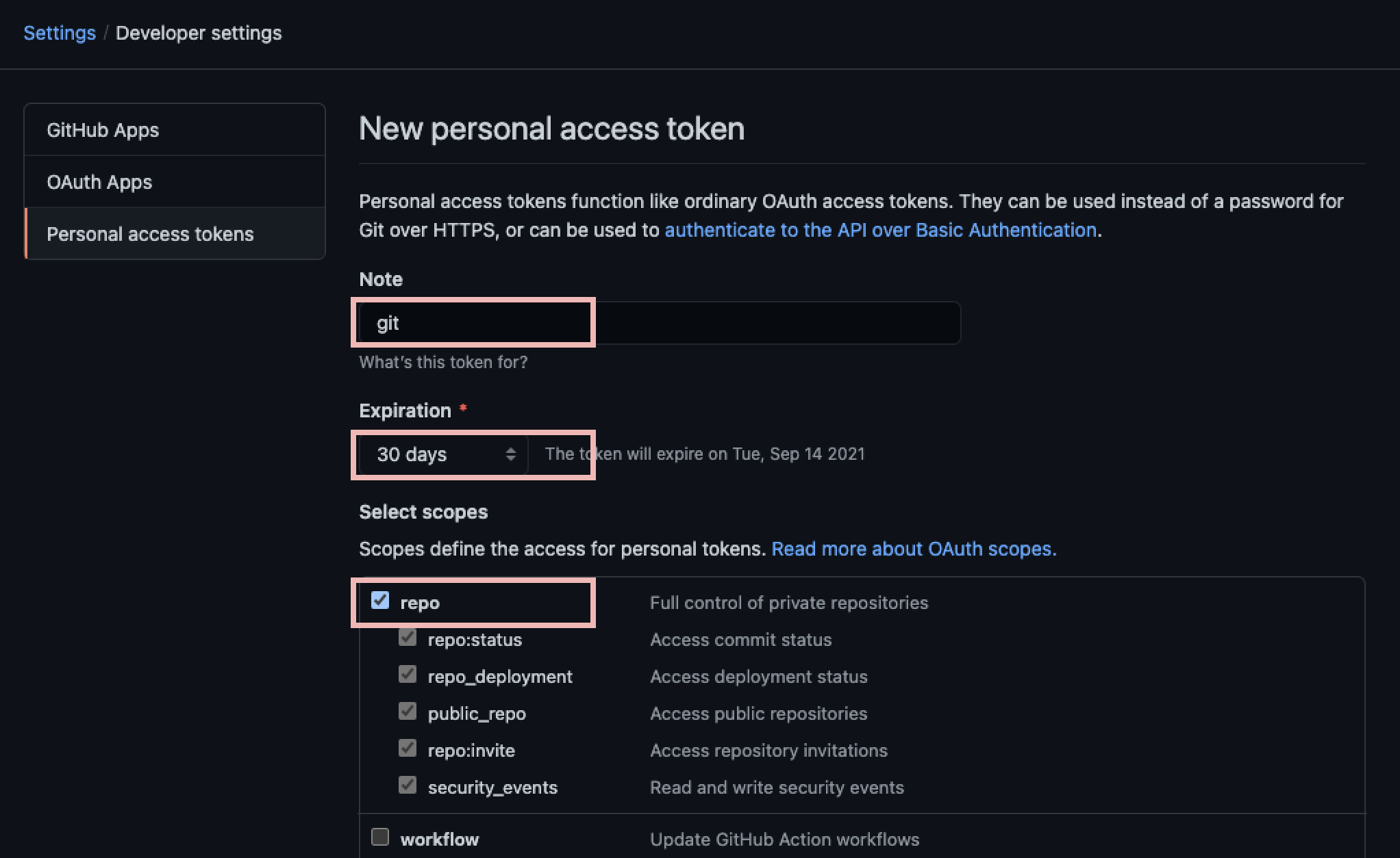 토큰에 어떤 권한을 줄지 선택한다. (일반적인 경우에는 그냥 repo만 선택해도 된다.)